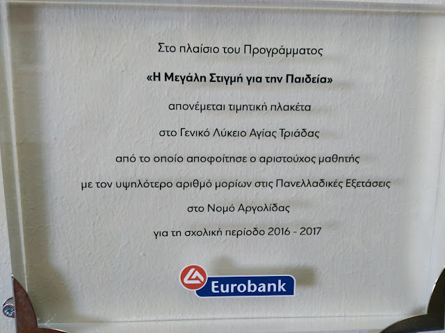 Την Παρασκευή 26 Ιανουαρίου 2018 πραγματοποιήθηκε στο Αποστολοπούλειο Πνευματικό Κέντρο Δήμου Τριπόλεως η 15η βράβευση των αριστούχων αποφοίτων που πρώτευσαν στις Πανελλαδικές Εξετάσεις 2017 στην εκπαιδευτική περιφέρεια Πελοποννήσου, από την Eurobank, στο πλαίσιο του προγράμματος «Η Μεγάλη Στιγμή για την Παιδεία» .